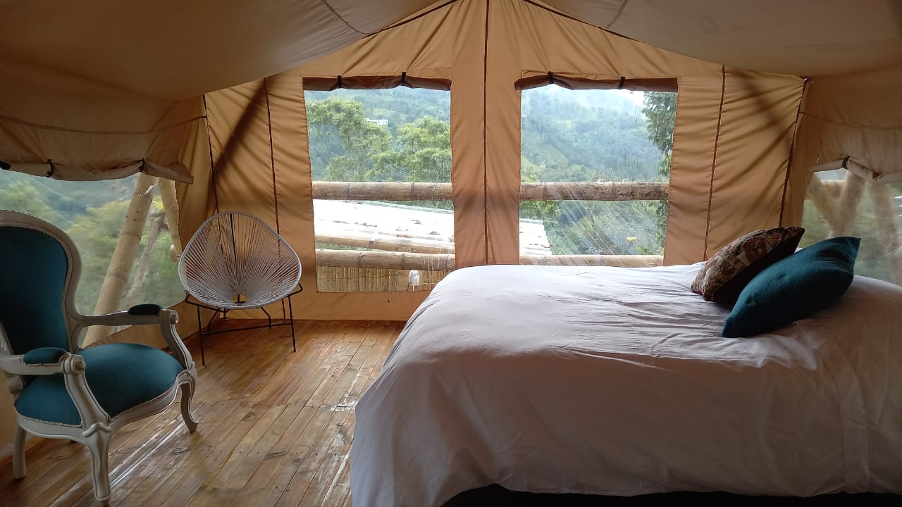 Glamping pionero con hermosa vista 180° en medio de los cultivos de Cacao, una cama Queen para disfrutar de una amanecer increíble y si lo deseas podemos ubicar un sofa cama para tus acompañantes, puedes disfrutar de una agradable terraza para disfrutar de tu estadía en compañía de un concierto natural de aves en las mañanas que harán de tu día algo especial.